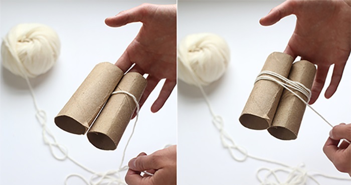 חתכו חתיכה נוספת של צמר וארגו אותה בין גלילי נייר הטואלט