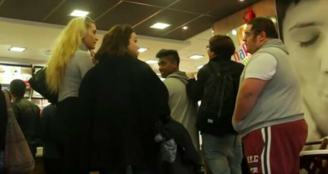 בהתחלה הבנות מדברות אחת עם השנייה, אומרות איך הן נגעלות מהאיש שעומד לידן בתור. אבל מהר מאוד הן מפנות את הכעס שלהן כלפיו, ואומרות לו באכזריות שהוא 'מספיק שמן' ושהוא לא צריך לאכול במקדונלדס. הן אפילו אומרת לו שהוא לא צריך לאכול בכלל.