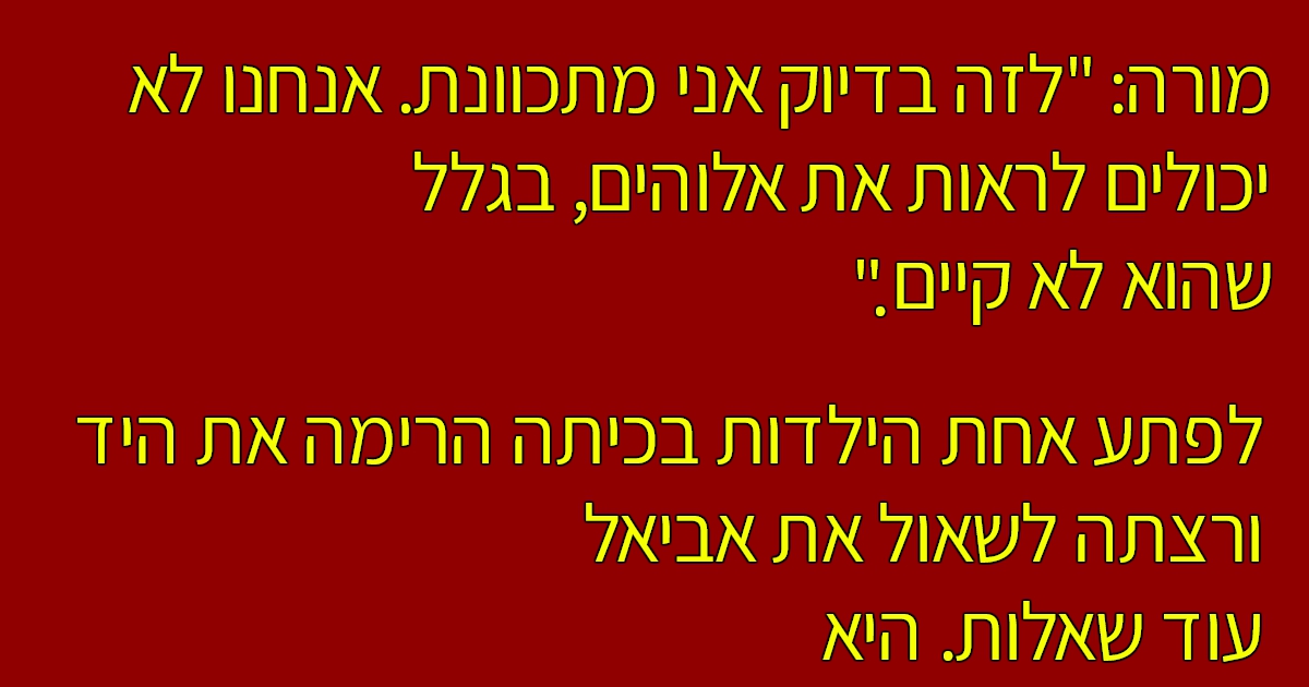 כדי להוכיח להם שאלוהים לא קיים, המורה גלית שאלה את אביאל.