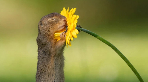 צלם תיעד רגע מתוק ביותר של סנאי עוצר להריח את הפרחים