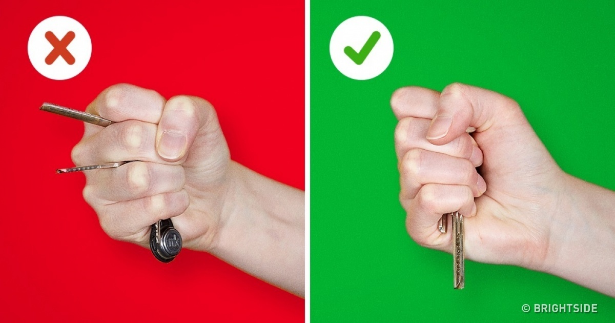 את העצה הזו רואים לא מעט ברשת: כדי להגן על עצמכם כשמתקיפים אתכם ברחוב, החזיקו את המפתחות בין האצבעות כמו בתמונה הגדולה למעלה. אך האמת היא שזה לא רעיון טוב, מכיוון שאתם עלולים לפצוע את עצמכם. כדי להכניס את המפתחות לתנוחה הזו אתם זקוקים לזמן, ולא בטוח שיש לכם את הזמן הזה.